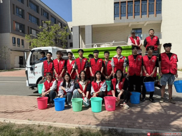 在学院南门草坪的新绿化区,师生们迅速投入劳动,拿起水桶往返于水源地与绿化带之间。现场分工有序:男生们配合洒水车合力铺设水管、搬运工具,保障水源供应顺畅;女生们则手持水桶,细致地将水引导至每棵树苗的根系周围。