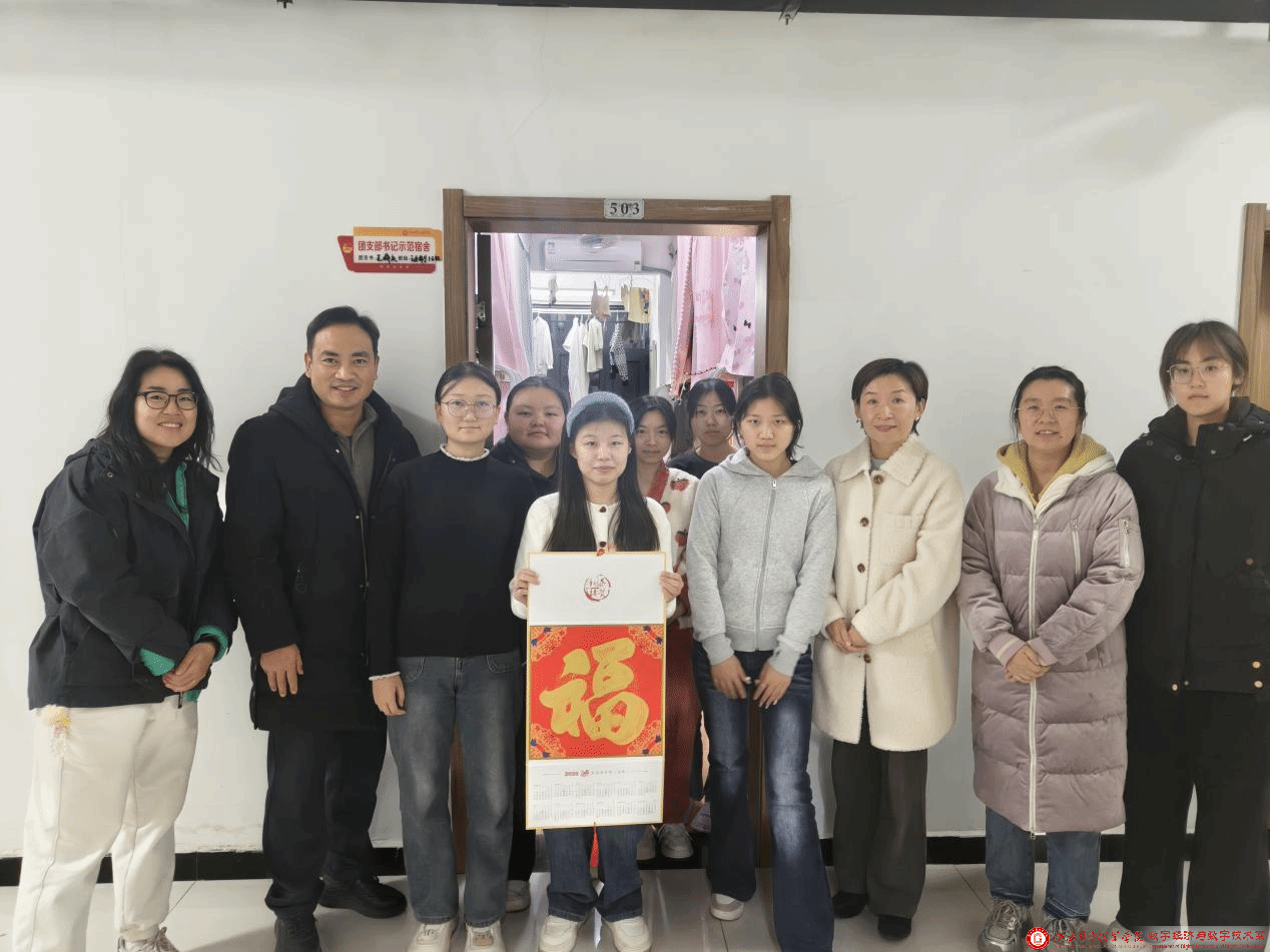 为进一步加强学生思想政治教育、日常文明行为养成,扎实构建“大思政”育人格局,充分发挥团支部书记在宿舍文明建设中的先锋模范作用,12月25日,学校党委副书记梁菀华、团委书记王珊、副书记薛江泉、数字经济与数字技术系党总支书记、副主任庄绪强、学生工作负责人屈婉聪、以及2025级学生辅导员带领学生骨干深入学生宿舍,为数字经济与数字技术系2025级“团支部书记示范宿舍”挂牌,以“亮身份、树旗帜”的方式激活宿舍育人阵地效能。